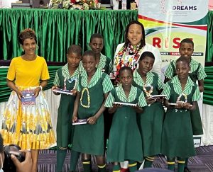 USAID Acting Mission Director, Priscilla Sampil with school girls from Gwanda district and their teacher at the ZHI DREAMS RISE project launch.